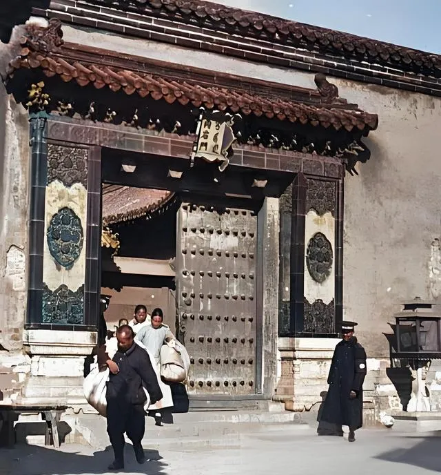 这个门匾叫宫门,门钉密密一排排,几个人抱着鼓鼓的行李往外走,脚步不快不慢,门槛有一点高,跨过去时肩头一沉,守门的把眼光往下压着,像是在数包袱。