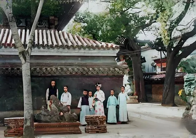 这个院子叫御花园,檐角挑得高高的,琉璃瓦压着白脊,墙根摆着太湖石和小几座,这一看就是讲究地方,图中穿长袍马褂的一家人排成一字,站得规整,袖口和衣襟都是绸面,颜色淡而雅,树影落在地面上,像撒了碎银,老照片一上色,仪式感就从画里冒出来了。