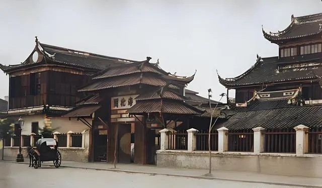 这个大门口叫海关衙门,匾额挂在重檐下,角楼挑着飞檐,门边立着一辆黄包车,墙里墙外是两种规矩,里头验货用的是洋法,外头看着还是中式的面子,木墙窗棂分得细细的,玻璃像薄冰一样亮。