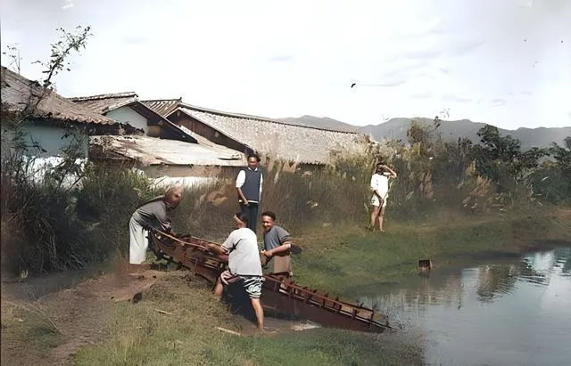 图里几个人正把这玩意儿扛到水边,这个木架子叫龙骨水车,一节一节的木格连起来,踩着踏板,水就顺着格子往上翻,小时候我见过一次,叔叔撸起裤腿站在泥里咯哧咯哧踩,脚下滑得很,水翻上沟面时,大家都松了口气,爷爷说以前全靠它浇地,“不上水,苗就渴得叫娘”。