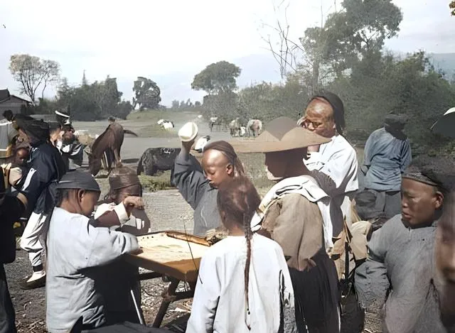 清末彩色老照片:同仁堂药堂伙计;两眼无神的农民;天宝号首饰铺。