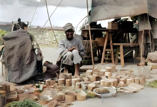 这两张挨在一起说更合适,前一张摊前都是小木盒小罐子,笑眯眯的摊主坐在地上,脚边一只破草鞋,后一张是木匠摆开的家伙什,秤杆、刨子、刻刀、药秤都有,手里还搓着草药杆子,像是在分拣,爷爷说那会儿做小买卖全靠手艺,“刀口下讨生活,天一黑就收摊”,没有灯箱也没有扩音器,但认手的人一远就能听出他的吆喝声。