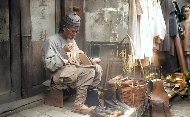 这位老匠人坐着小方凳,腿上横一把鞋楦,粗针穿着麻线一针一针往回带,脚边摆着刷子、蜡、锥子,阳光照到他的手背,青筋鼓起来,奶奶说以前鞋坏了舍不得扔,“能补就补,补到补不了再说”,现在呢,鞋子底一开就换新的了。