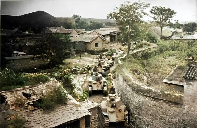 这个角度是在墙头上拍的,坦克像甲虫一样沿着狭窄巷道排成一串,履带压过碎石,屋檐下的草垛歪倒一半,石墙缝里长着野花,颜色被上色后显得安静,可履带过去,安静就没了,爷爷说,听见履带声,鸡会先叫,狗就不叫了,人也不敢出门,心理这根弦,一碾就断。