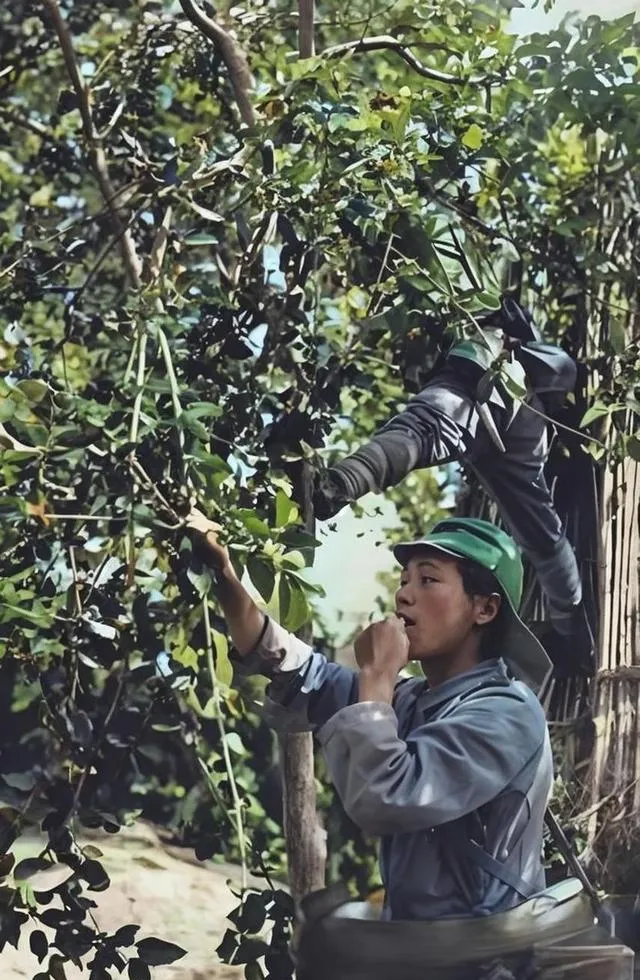 这个动作熟,左手扒枝,右手往嘴里塞,还用虎牙剔着果皮,袖口上的扣带勒得紧,腰间水壶晃晃当当,一看就不是第一回进园子的人,外公说那时候果树是当柴火的命根子,青果掐光不算,转头还把树杈劈做灶引,等来年春天,树泪都没处流。