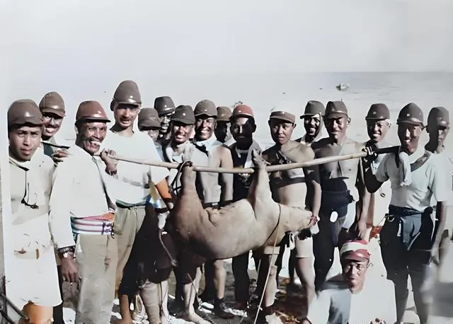 这一张我不想多写,光膀子,腰间缠着布,手里碗是铁的,上面盛的油汪汪,背后树上吊着还没摘干净的果串,大家挤在一起摆姿势,像过节,可镜头外是空院子,没有主人的脚印,只有乱七八糟的锅盖和散落的筷子。