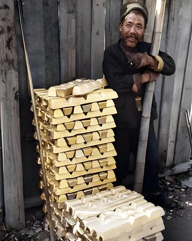 图中这一摞亮堂堂的家伙叫金锭,规矩的倒角像切豆腐,几块压成一盘,盘下是木槽,侧边立着一根毛竹挑杆,搬运工靠着篱笆喘口气,手上全是老茧,笑得随意却不敢离太远,他说夜里风紧,得看着点,谁要是伸手,挑杆一横就能挡住,冬天北风刮得人直掉眼泪,那时候票子越印越薄,一锭金能顶一屋子的米,现在我们谈理财,那会儿人家就认这个硬邦邦的分量。