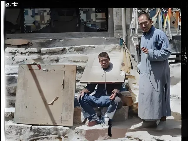 这个木板把脖子卡住的叫项枷,板子厚,边角毛糙,正中挖孔,绳子从背后穿过去打结,旁边人拎着香和纸,脸上是那种认真的劲头,奶奶看见这张照片叹了口气,她说以前穷人求平安,发了愿就得还,轻的撑红纸伞烧香,重的套枷锁链,走几条街让神明看见,心里才踏实,以前苦啊,靠虔诚换个盼头,现在要想通得多,生病去医院,求学有贷款,心诚还在,刑具就不用了。
