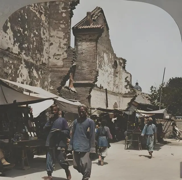 这排斜撑的布棚就是临时摊位,竹杆木桩搭起来,布篷投下清清的阴影,身后是被炮火剥落的砖墙,摊上摆着日用小物,壶盏刀剪一字排开,路人脚下尘土白,眼神却忙着讨生活,爷爷说,有烟火的地方,日子就不会彻底塌,以前逛集市要绕着摊棚找能省两文钱的门道,现在手机上一滑,快递就到了,但那股人挤人里砍价的热闹味儿真是没了。