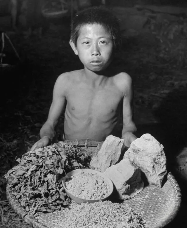 这个簸箕里堆着的树叶、研磨过的树皮和一碗粉末,老人们喊它观音土,能顶一会儿饥但伤身子,孩子瘦得皮包骨,眼神却直直看着镜头,让人心口发紧,外婆讲过他们那阵子把野菜挖到根,锅里咕嘟的味儿是苦的,现在超市货架一排排,挑拣的手都不带抖一下,想起这张图,筷子都轻了点。