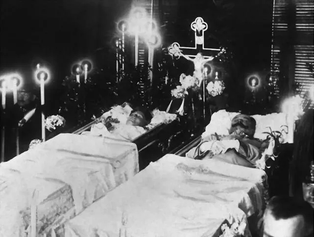 这排亮着光环的蜡烛叫洋烛,金属烛台细长,背后木十字映着光,白布罩着灵床,花束挤在边上,静得只听见烛泪落盘的细响,姥姥念叨,旧时办丧事讲究的是稳重,烛火要稳,纸花要齐,现在城市里多是鲜花素纱,仪式换了,想念还是那回事。