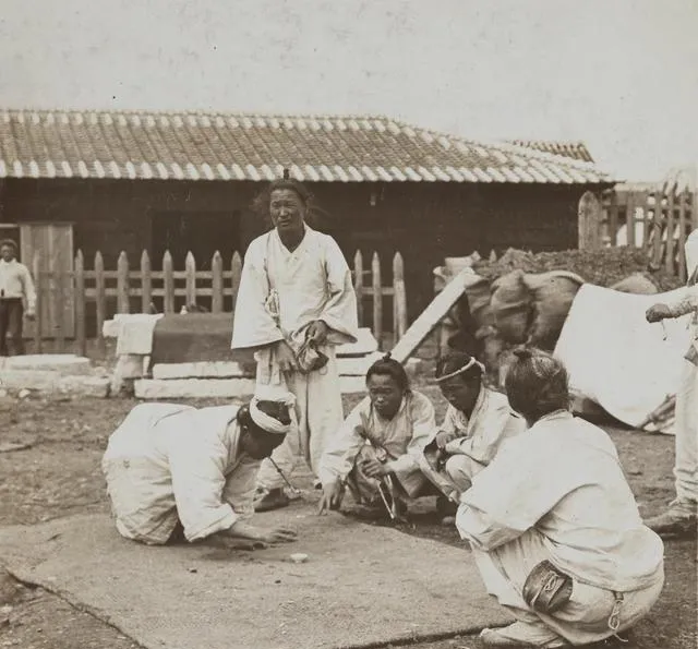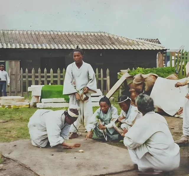 地上滚的那几块木头叫柶,当骰子使,掷出去看正反面定步数,几个人跪趴着盯,手指一点,棋子往前挪,围观的人忍不住抽气,这类街边玩意儿,热闹全在一抛一落之间,现在手机里也能投骰子,可屏幕不带土,笑声也飘不起来。