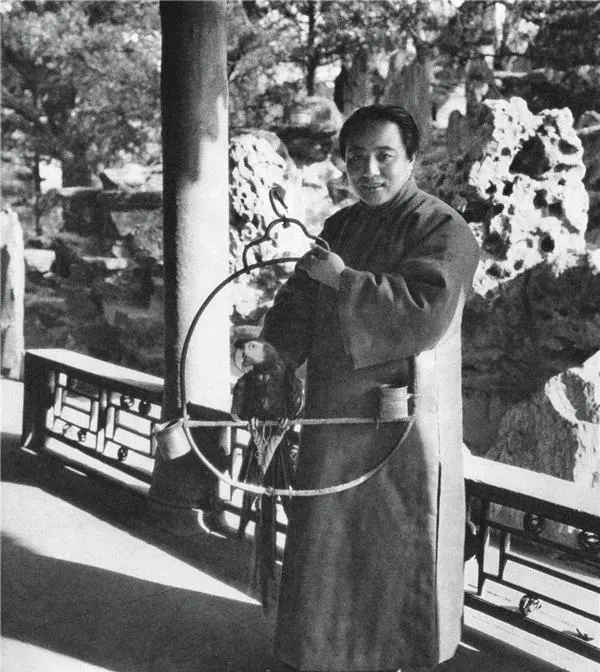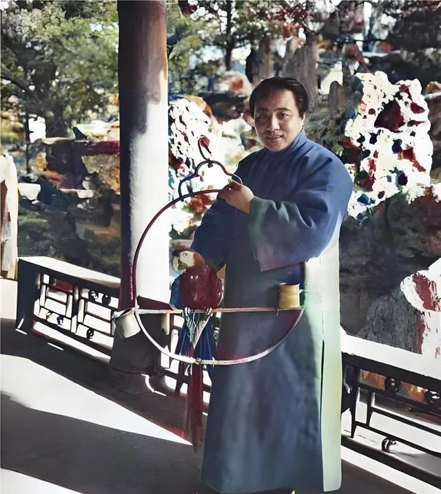 图中这圈形的木铁合成栖架就叫鹦鹉架,圆环外包着细皮,手握处还有个小杯子装鸟食,红绿羽色的那只站在横木上,神气得很,穿青色长衫的先生托着架子站在亭廊下,石假山影子斑驳,院子是老北京院子的气派,奶奶以前看照片就感叹,这东西讲究的是闲情,得有院子有时光才玩得转,现在阳台上挂个鸟笼也算过把瘾,可冬天一刮风,谁还这么慢悠悠地溜鸟。