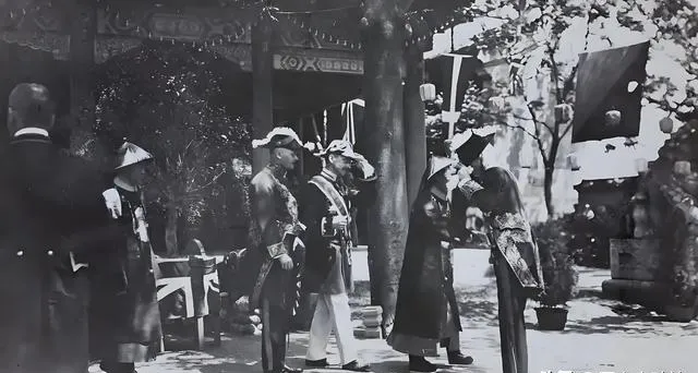 图中这一幕叫东交民巷的行礼,官袍是深青缎面,马蹄袖下垂,帽顶点着亮晶晶的顶戴,旁边的西式军官胸口一排金灿灿的章,站姿笔直,树影落下来,像在给人群切块儿打光,老人看见这张图就说,清末最讲究的就是这一拜一让,气口拿捏得准,面子也就保住一半了。