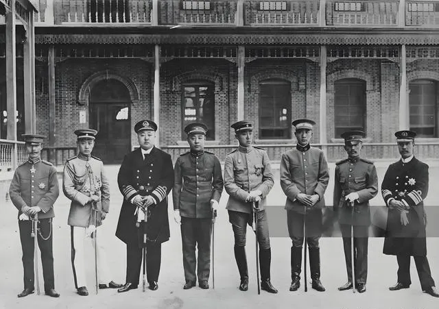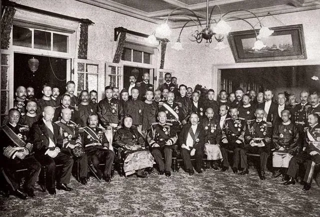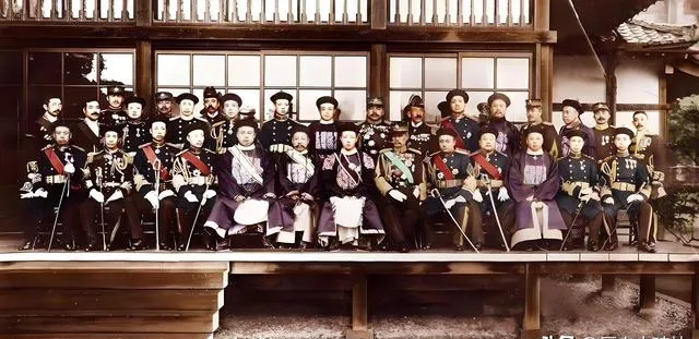 这个木台阶前的阵仗叫日式会晤,纸拉门后是四方格的暗影,前排锦缎袍服和军服挤在一起,武官的肩章和满绣马蹄袖挨得很近,像两套制度硬凑到一张画框里,老照片能装下的和气不少,真正的较劲都在镜头外面躲着。