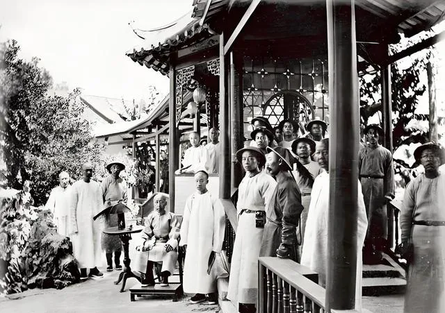 图中一院人叫官邸家丁与随员,廊柱漆黑发亮,栏板透着花格,衣服多是浅色绸布,袖口宽松,站在台阶上的少年眼睛亮晶晶的,左下角一张藤椅斜着摆,像是刚刚起身让座,我外公指着这张说,排队站位可有规矩,谁靠近主人谁说话就得注意点。