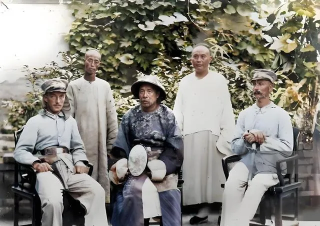 这个坐在中间握着团扇的叫年长军官留影,帽沿压住眉骨,脸被扇面衬得更深,左右两位外兵制服别着宽腰带,扣子一粒粒往上排,后排的长衫人抬着下巴,像要把气度抬出画面,照片一上色,背后葡萄叶的绿就活了,整张图的气色都跟着暖了。