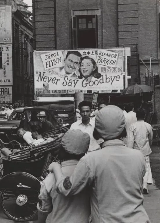图中这面墙上挂的叫电影巨幅海报,上面两个笑脸一男一女,英文名挤在中文边上,风一吹纸角哗啦啦抖,路口一辆黄包车停在边上,黑亮的车辕配着黄漆车厢,像刚擦过油一样干净,两个穿工装的年轻人并肩走,胳膊一搭就是朋友的劲儿,妈妈看见这张就笑,说那会儿去看外片得排队,买票窗口像蒸笼一样热,现在谁还抬头看墙上大纸啊,手机里滑两下就完事了。
