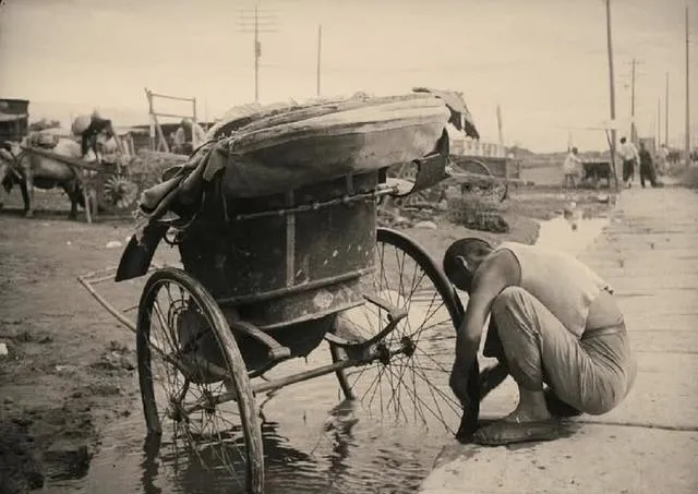 这个姿势一看就懂,车夫把车轮探进水里,手掌摸着钢丝辐条,指关节抵着轮圈试松紧,裤脚卷到膝盖,脚面粘着泥印,爷爷说跑一整天,车胎最怕瘪,晚上不仔细瞧一眼,明儿路上掉链子可就耽误活儿了,现在打个车轻轻一点,车从哪来不管,最多埋怨堵车,谁还会弯腰照看一只轮子。