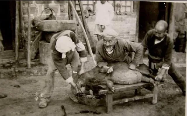 这个木凳子搭的叫杀猪台,三个人一压一按一牵,屠夫的短刀放在脚边,刀背油亮,盆里血线绵长不停歇,我小时候最怕这声,瘆人却热闹,姑父一边盛水一边吆喝,奶奶挎着篮子在旁边等肥肠,嘴里嘀咕今晚得把灌肠煮透点,冬天的风刮过来都是肉香,现在讲究净菜真空袋,家里小朋友连杀猪锣都没听过。