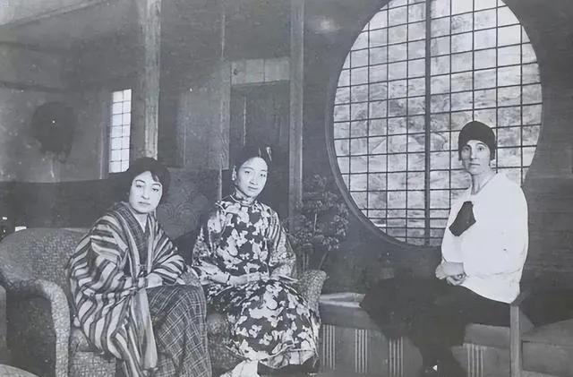 这个圆圆的窗子叫月洞窗,纸糊窗棂把光切得很柔,三位女士坐姿端正,左边衣摆是几何格纹,右侧那位戴着小黑帽,屋里放一盆矮松,枝针细密,妈妈说老天津卫的屋里就喜欢这么雅致,不用多话,摆一盆绿就显规矩,现在装修讲究极简,圆窗少见了,取景一抹就成滤镜的活儿。