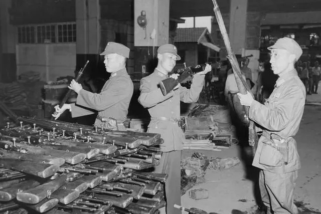 这堆木托铁身的叫缴获枪械,桌上码得像木头铺子,左边那一摞枪管长,枪托线条厚重,右边矮一截,军官举起一支端详,手指扣着扳机护圈,袖口的褶皱都被灯光照得清楚,叔叔说这类枪型号多,不用非得抠名字,摸着趁手才是好枪,现在大家看枪都在电视剧里,镜头一转就进特效,真枪的重量你是不知道的。