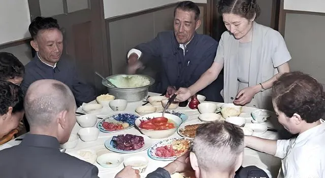 这个屋子里摆满碟子碗盏的场景叫团聚会餐,图中红白相间的拌番茄,一旁还放着鸡蛋饼和肉菜,碗边冒着热气,最显眼的是那口铝锅,勺子插着,像是土豆泥或者粥,桌子周围坐着七八个人,你来我往夹一筷子,我外公看了照片说,人道主义不是说说的,日子再艰也要把饭菜整齐摆上桌,这话他讲得平平淡淡,却扎心。