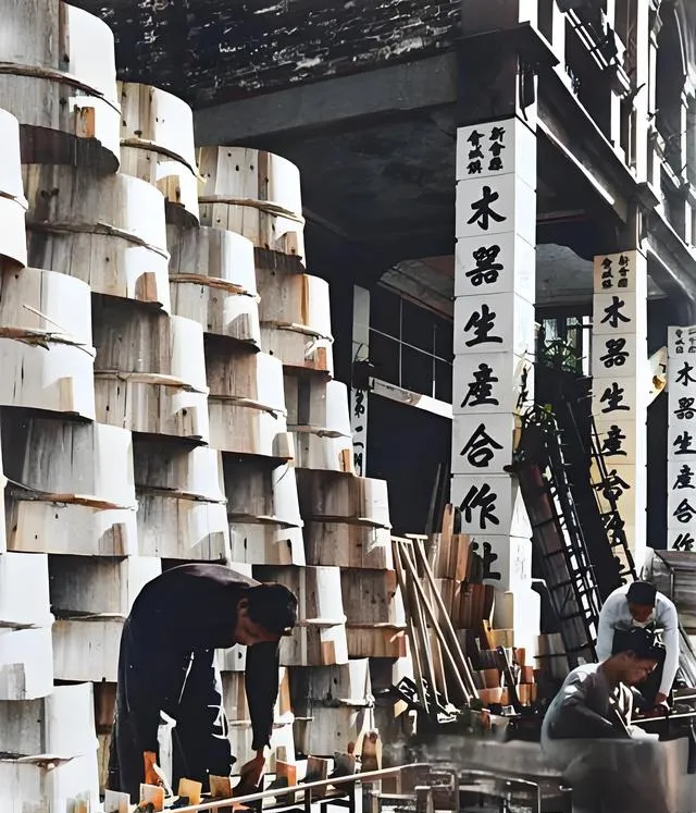这一摞一摞的木圈子是木桶坯,地方是会城的木器生产合作社,木板纹理清清楚楚,光是看就能闻到木香,师傅低着头打磨,旁边靠着一把长柄刨,门口立柱刷着粗黑字,写着木器生产合作社四个字,奶奶说那会儿订单难,大家把股金凑一凑,先把活儿开起来,木桩一圈圈码得齐,像盼着一桩桩新生活落地。