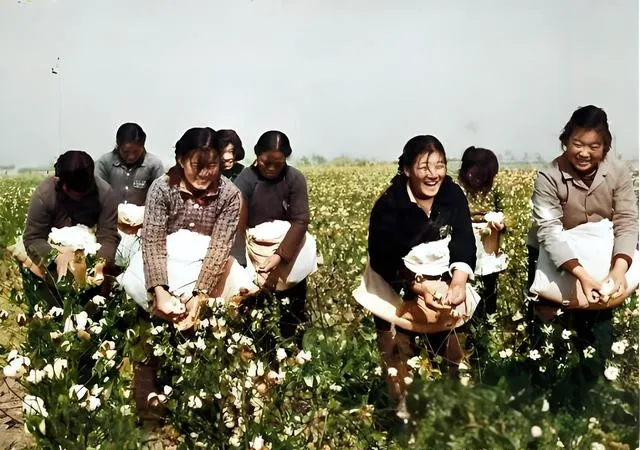 这片白花花的是棉田,女社员抱着布袋往里装,笑得见牙不见眼,衣袖挽到胳膊肘,风从田垄上刮过去,棉朵轻轻晃,小时候我跟着舅妈下地,手伸进去一扯,软得像掰云朵,回家把棉絮摊开晒在竹床上,太阳一晒,味道暖烘烘的,现在城市里买被芯一拉链就好,那种手里揉棉的踏实感,真是回不去了。