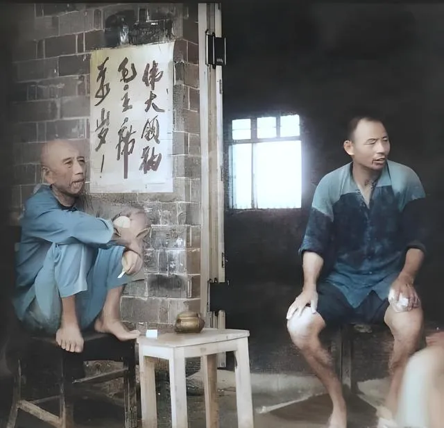 这张照片里坐小凳子的老同志,穿着洗得发白的蓝褂,门上贴着几行字,边上摆一把搪瓷壶,场景叫红星垦殖场的院口歇脚,他膝盖顶着肚子,像咱家老支书聊天那样憨厚,旁边人一壶一话,都是关心庄稼和天气,妈妈看完小声说,人一到位子上,最难的是还像个普通人,这幅样子,亲切。
