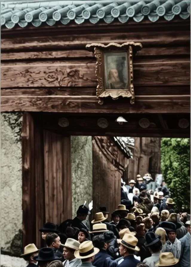 这个口子上头挂着画像框,你看木梁的年轮纹都露出来了,队伍正往里拱,个把人回头张望,像是在找同伴,声音我能想见,鞋底子蹭青砖,帽沿互相磕碰,嘈嘈切切,跟庙会似的,过去逛的是天街地摊,现在逛的是帝王家当,同样是逛,心气不一样了。