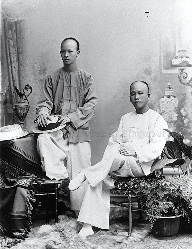 图中这对青年是照相馆里的老式合影,立者脚踩圆凳,手里按着一顶西洋礼帽,坐者歪靠椅背,腿一翘,气定神闲,最抓眼的其实在脚下,褐灰色的狼皮毯铺着,绒毛顺光发亮,边上压着一角织锦披毯,像是为了显摆体面,屋里摆了黄铜花盆和折枝花纹屏,做旧的布景是那个年代照相馆的标配,讲究个气派又不失温吞的雅致。