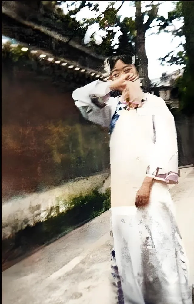 这张就更简单了,抬手掩着笑,宫墙一溜灰绿,地上是粗糙的石道,脚边拖着云肩纹的衣摆,小时候我翻外婆的老箱子,也见过这种缎面绣法,摸上去凉飕飕的,外婆说,拍照那天要少喝水,别把脸照肿了,现在呢,大家更在乎滤镜,照片倒是更亮,可笑意总差点真气。