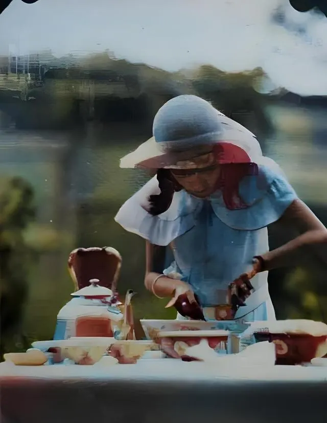 这几张是西餐台面,茶壶、瓷碟、黄油块,都摆得利索,帽檐宽大,衣领是翻盖圆角的,手上正切东西,刀背敲在案板上,像能听见咚咚声,妈妈看了说,那个时候爱吃西洋点心是时髦,黄油下得重,胃不舒服也要撑着气派,以前做饭讲排场,慢慢来,现在一口气全是快手视频,十秒钟教你做晚饭,香味却来不及落地。