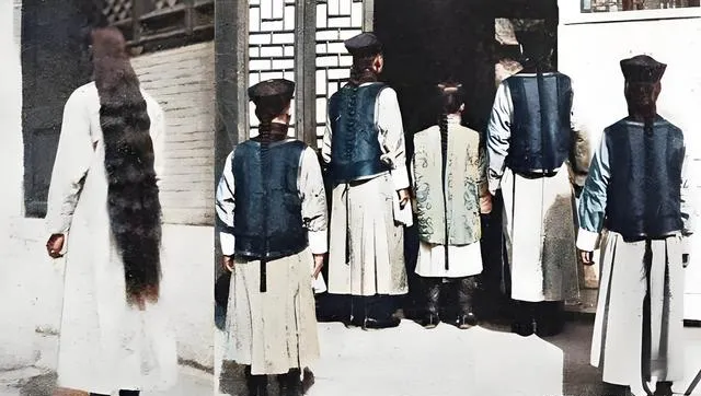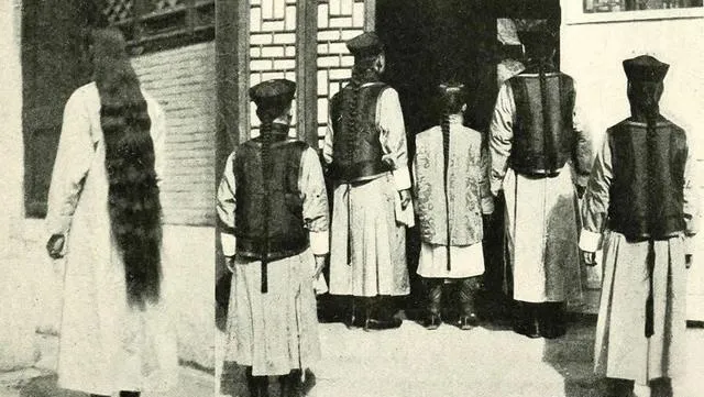 这组是难得的背影,辫子从头皮一路顺到腰下,油光水亮,宽袖长袍在阳光里起褶儿,摄影师显然是外来的,叫他们转身让他看个够,男子们也不扭捏,抬手把辫梢提起来,像在说,你们稀罕的,我们早就习惯了,以前辫子是规矩,现在头发爱咋剪咋剪,理发店贴墙的海报一换一片风格。