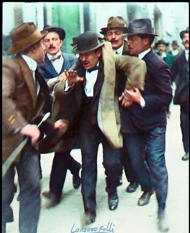 图中这阵仗叫街头抓捕,呢绒大衣、硬呢礼帽、胡子拉碴的嘴角沾着血丝,几只手一把一把拽住人的肩膀和前襟,袖口的扣眼都快崩了,鞋跟在石板路上打滑,像是刚吼完一句狠话就被人按住了,画面里全是力气的褶皱和愤怒的呼吸,以前报纸上一行字就带过去的新闻,现在被颜色一抹,人的温度就冲出来了。