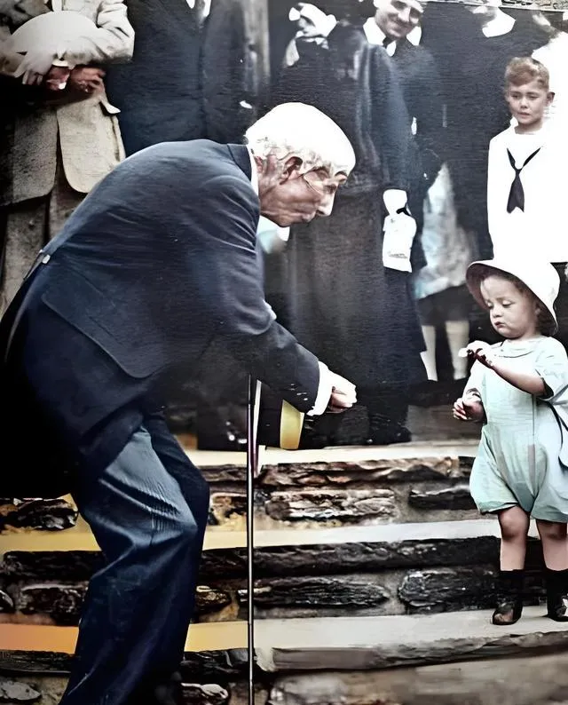 这个场景叫台阶馈赠,老先生弯腰递出一枚硬币,黑呢西装配手杖,小孩穿浅色连体衣,脚边台阶是黄边石,边角被踩得发亮,旁人站在后头看热闹,镜头像把气氛都收住了,奶奶看见这一张就嘀咕,给钱也别当众递,孩子脸皮薄,拿得也不痛快,她这句话我现在才听出味道,礼和施,隔着一层薄薄的体面。