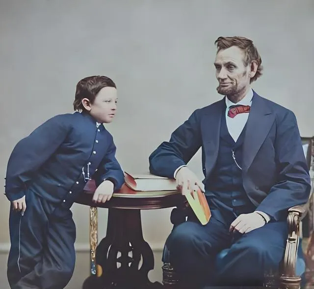 图中父子俩的姿势叫坐谈,深蓝三件套、红色领结压着白衬衫领,桌上一摞厚书,封皮有点卷边,孩子探着身子凑近,像要追问一句为什么,林肯把手搭在书脊上,神情半笑不笑,像在想词,小时候我爸教我背课文,也总这样把手放在书上,一句一句领着我念,他说,书不是给你吓的,是给你抓着走路的把手,这张照片一上色,这句话就从记忆里晃出来了。