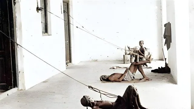 这个装置叫人工电扇,真不夸张,粗绳从梁上斜着拉下来,男人半躺在地上,脚腕勾住绳环,手搭着另一根,来回拉动,天花上那片大扇叶就慢慢摆,汗从肋下拖成一条亮痕,地面泛白的水渍一圈一圈,爷爷说,热得冒火的午后,拉一天风扇挣不了几个钱,但停一会儿上头管事的就来敲棍子,以前消暑靠人扯风,现在轻轻一按就是冷风,这冷风也把很多人的辛苦给吹没了。