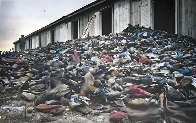 这堆东西叫鞋山,皮靴、布鞋、高跟、童鞋,颜色乱得像打翻的染缸,鞋头朝天的多,鞋跟朝天的也多,门洞开着,黑得像吞口,风从侧边刮过,鞋带一条条搭在边上发抖,这一张不需要多说话,越看越不敢深呼吸,照片把缺席的人拍得最满,这就是上色的另一面,把看不见的,也逼着你看。