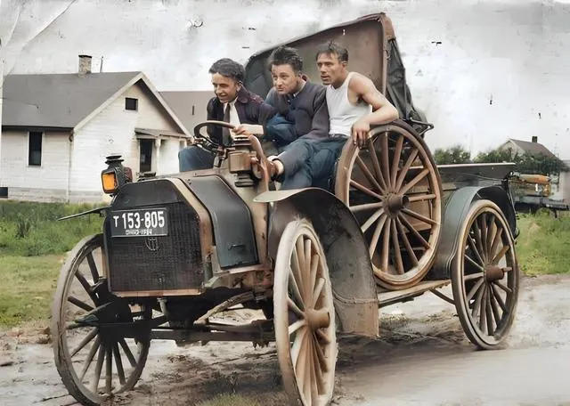 这车叫敞篷老福特,前脸铁壳生着斑驳锈点,木辐轮子一圈一圈扎实,软篷半掀着,三个人挤在前座,笑得前仰后合,车牌黑底白字,泥路把轮胎边全糊了,油灯挂在一侧还亮着黄,舅舅说,年轻时候贷款买过一辆旧车,跑到郊外吹风,油钱顶一天工钱,但值,风吹到发梢的那会儿,人会觉得日子也能往前跑。