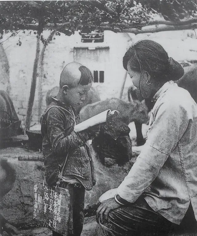 这个小书包其实是块木书板,边角磨得发亮,上面刷了字,孩子留着当年的小揪头,怀里捧本薄薄的识字课本,旁边的妇女半蹲着看他读,像是教员也像是母亲,奶奶说那阵“先识字再识路”,学会写名儿就有了脊梁,这句听着质朴,可一点不虚,识字班散在窑洞、树荫下,读书声短促而急,背后常常就是牛圈与炊烟。