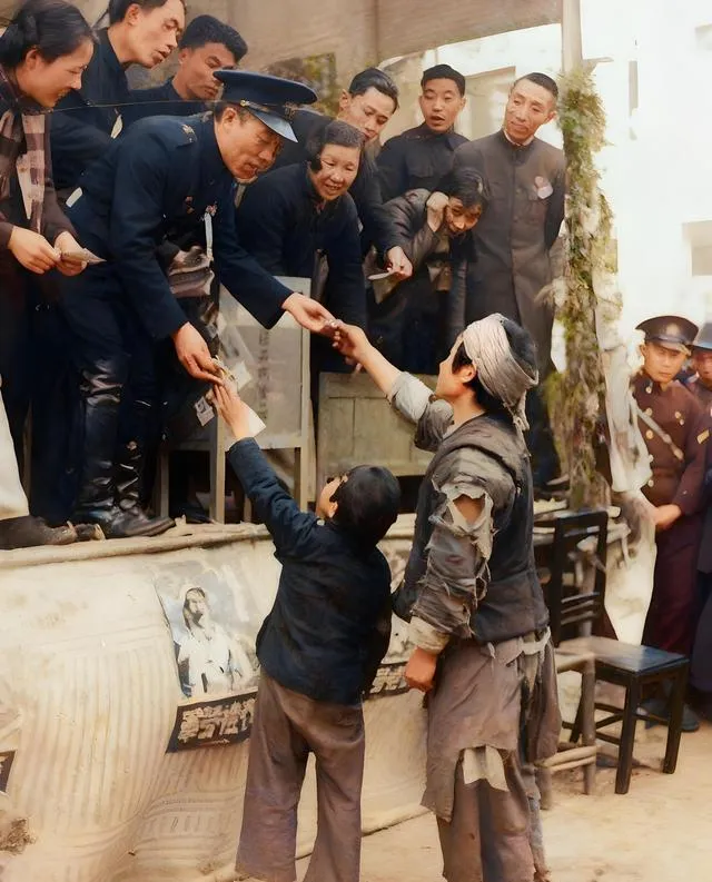 这张我盯了久一点,破衣烂衫的男人抬手,袖口全是补丁,孩子也学着伸手,台上穿制服的警察俯身去接,台下人群有人笑有人沉默,妈妈看见这张就唏嘘,说“口袋里不一定有钱,心里一定有数”,那时候捐的是一分一厘,现在捐的是指尖上的数字,热度来得快也散得快,可这张照片的火苗子还在往上蹿。