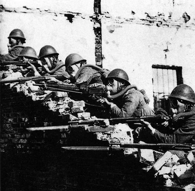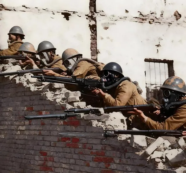 这个场景不用多解释,砖墙缺口像被兽咬过,几名日军趴在上面,面具的玻璃眼冷冰冰,长管子歪着垂下,枪口一排指向前方,战场的声音你听不见,可呼吸在这张里都变得又闷又沉,这类照片像证物,摆在那儿不动声色,提醒你人可以坏到什么份上。