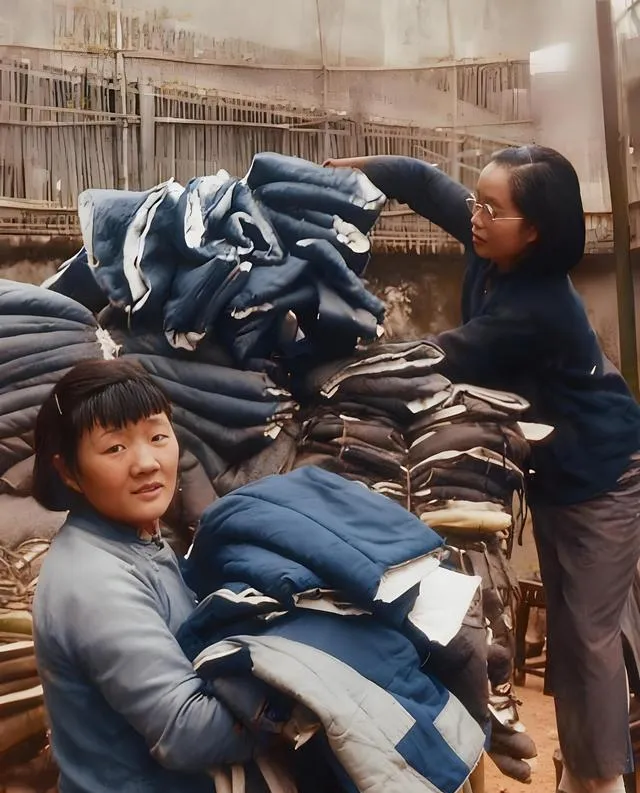 图里两位女子忙个不停,蓝布棉衣一叠叠压得稳当,一件翻到外面露出白絮边,手上没戴手套,动作却利索,四川那会儿是大后方,远离枪炮却处处连着前线,缝衣做被这活儿不显山不露水,但上了身就是一层命,奶奶常说“针脚密一点,北风就进不来”,这话简单,也实用。