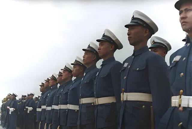 图中这身藏蓝呢料的军装叫礼宾制服,肩章挺括,白色皮带扎得齐齐整整,配的是白呢大檐帽,帽舷边的黑带在光底下微微发亮,队列一字排开,侧脸全是硬朗的下颌线,口令没响呢,气势先到了,爸说他年轻时看阅兵,最惦记的就是海军队那一抹蓝,干净利落,拿现在的话讲就是一个字帅。