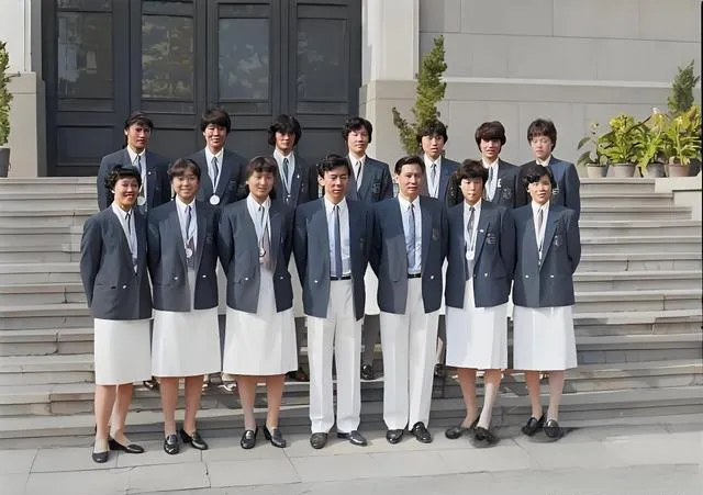 这一身灰蓝西装配白裙的行头叫代表团礼服,翻领上别着小小的徽章,袖口压线利落,鞋跟不高不低,站在台阶前整齐排开,阳光顺着肩线滑下来,照得黑发发亮,叔说那年送行他就在马路牙子上,没抢到一张合影,只记得人群里喊了一遍又一遍的加油,现在出国开大会的照片太多了,可像这样一本正经站在镜头前的仪式感,还是让人想收藏。