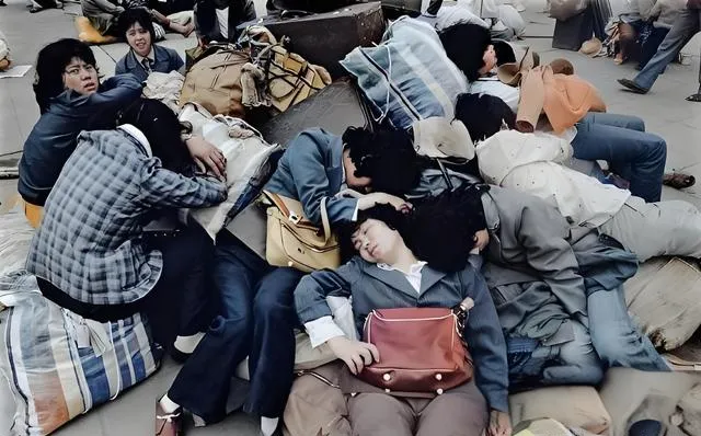 这个五颜六色的软包叫蛇皮口袋,结实耐造,配上泡沫垫子和棉被,就是一套移动的家,姑娘们靠着躺着,睡姿各不相同,脸上是赶路后的困倦,包的拉链处露出几件花衬衫,外头人声鼎沸,她们在吵闹里偷回一点宁静,小时候我跟着妈去车站送人,脚边都是这种大包,现在行李箱咔哒咔哒的轮子一滚就走了,肩上的重量轻了,心上的牵挂还是没少。