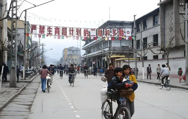 这个高高挂起的布带叫宣传横幅,红底白字一眼就能看清,横跨在灰白街巷的上空,底下骑车的人流顺着过去,棉衣风挡被气流鼓起来,外婆说那年到处都在口口相传一套规矩,街道办门口的黑板报每周都换,如今换成了手机弹窗和社区群里的一行行通知,传播工具变了,街头那种一句话说给所有人听的力度,照片里一眼就懂。