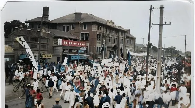 图里是街口旧景,牌匾一块挨一块,黑底金字很体面,推车人从边上绕,巡警站在路当中,像一颗不动的钉,游行队伍从画面右侧穿过,风把旗面吹得哗啦啦,旧城的缝隙里,挤满了新声音。